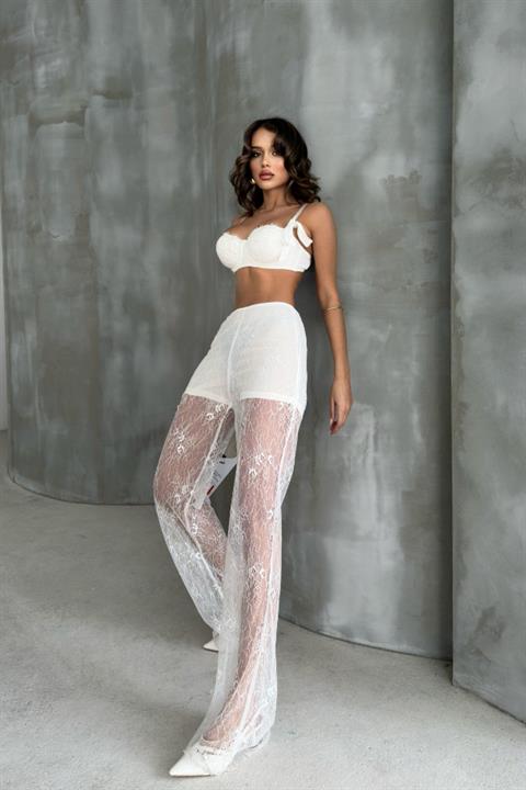 ransparante kanten broek met geïntegreerde shortvoering voor extra comfort en stijl. Ideaal voor zomerse outfits of stranddagen. De ecrukleur zorgt voor een verfijnde en luchtige uitstraling.